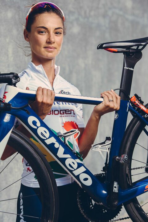 Cyclist Ashleigh Moolman Pasio posing with bicycle wearing sports attire by Cape Town photographer Casey Crafford