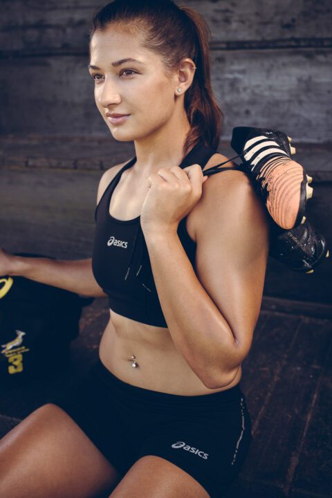 Paralympian Ilse Hayes in sportswear training on a track by Cape Town photographer Casey Crafford.